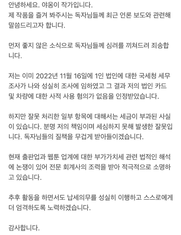 야옹이 작가 탈세 사과문