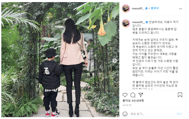 제 몸에서 한순간도 떼어 놓은 적 없이 한 몸처럼 살았던 아이인데 어느덧 초딩(초등학생)이 된다.제 삶의 원동력이며 가장 소중한 존재이자 평생 지켜야 할 존재기에 저는 매일매일 지치고 힘들어도 힘을 냅니다. 그렇게 소중한 만큼 많은 분께 저의 개인사를 이야기하는 데 있어 조심스러웠던 부분이 있었다.