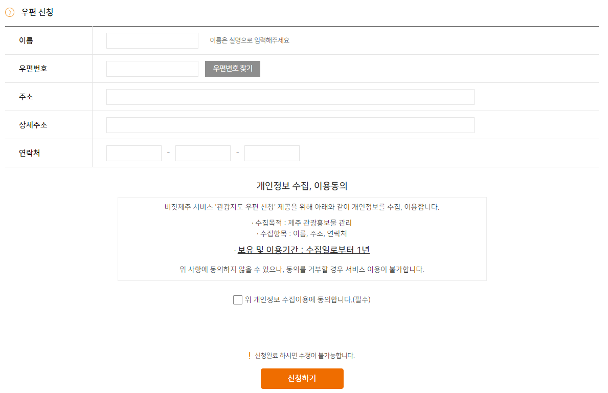 ◆ 아래 이름, 주소, 연락처를 입력 후 개인정보 수집이용에 동의하신 후 신청하기를 누르시면 약 2주 후에 제주 관광지도를 무료로 받으실 수 있습니다.
