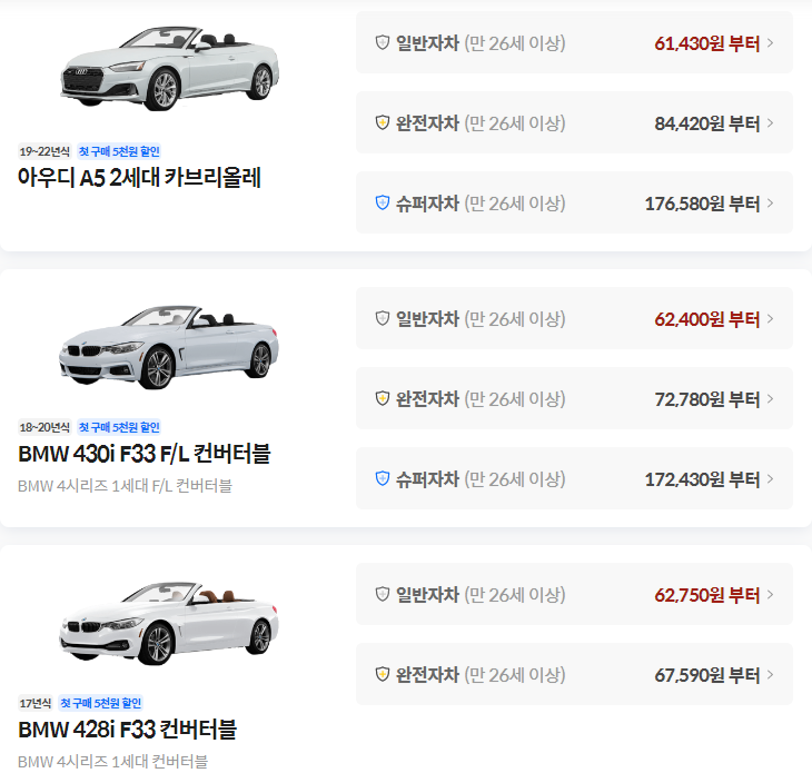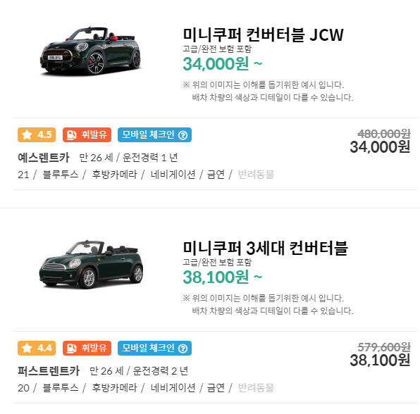 미니쿠퍼 컨버터블이 25,200원으로 비싸지 않은 가격이네요. 많은 제주 렌터카 업체의 가격을 비교해 보고 합리적인 가격으로 예약하세요.