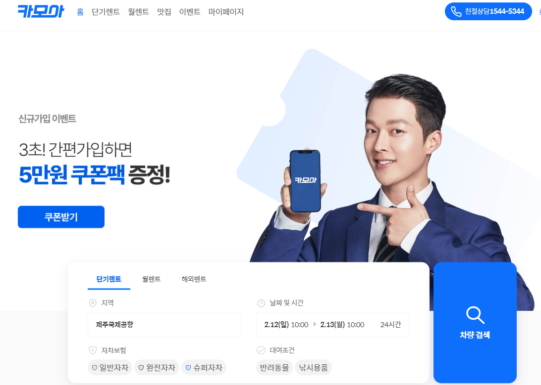 두 번째로 소개해드릴 사이트는 카모아입니다! 국내 해외 렌터카 예약이 가능하고 3초 가입 시 5만 원 쿠폰팩도 지급하고 있습니다. 단기 렌트뿐만 아니라 월렌트 같은 장기렌터카도 알아볼 수 있습니다.